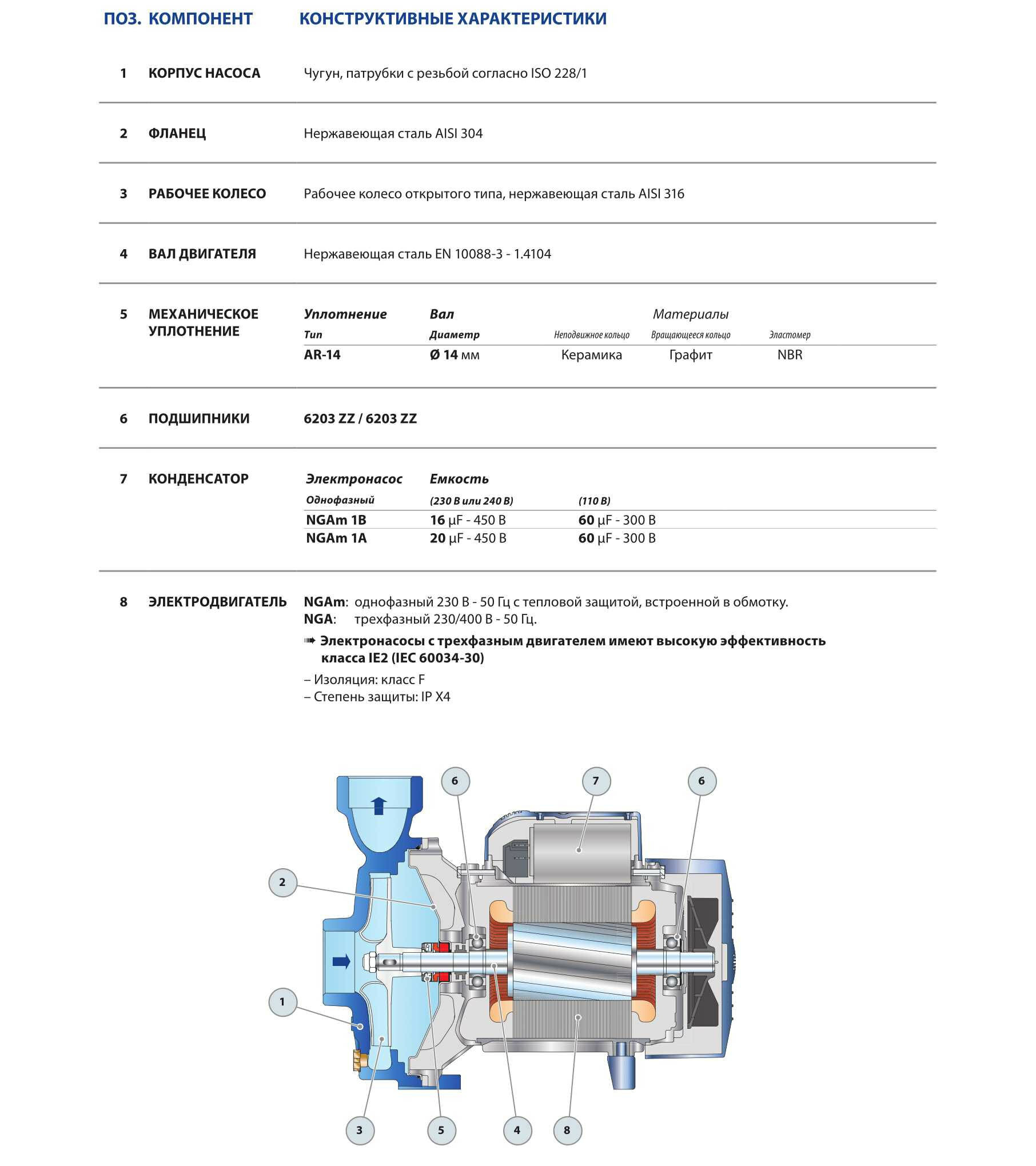 Насос центробежный Pedrollo NGA 1A - 0,75 кВт (3x230/400 В, PN6, Qmax 400 л/мин, Hmax 20,5 м)
