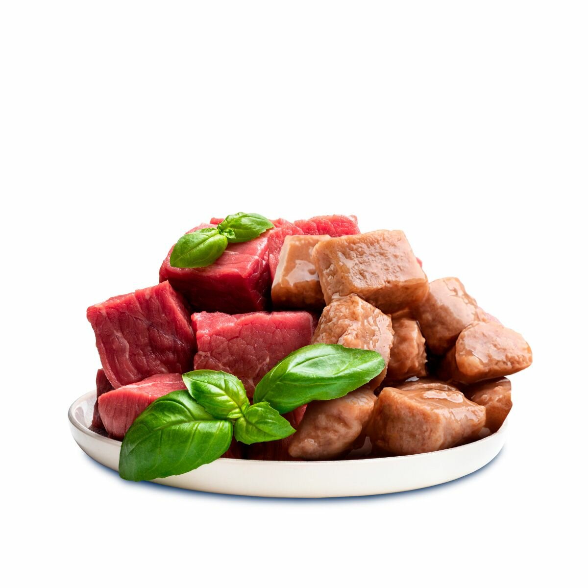 | Состав | 75% мясо и мясные субпродукты (в том числе телятина 10%), мука рисовая, мука пшеничная, клетчатка свекловичная, рыбий жир, минерально-витаминный комплекс, загуститель |