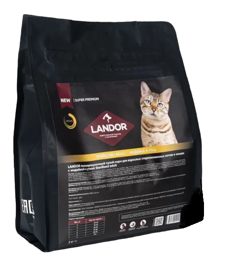 LANDOR CAT ADULT STERILIZED для взрослых кастрированных котов и стерилизованных кошек с индейкой и уткой (2 кг)