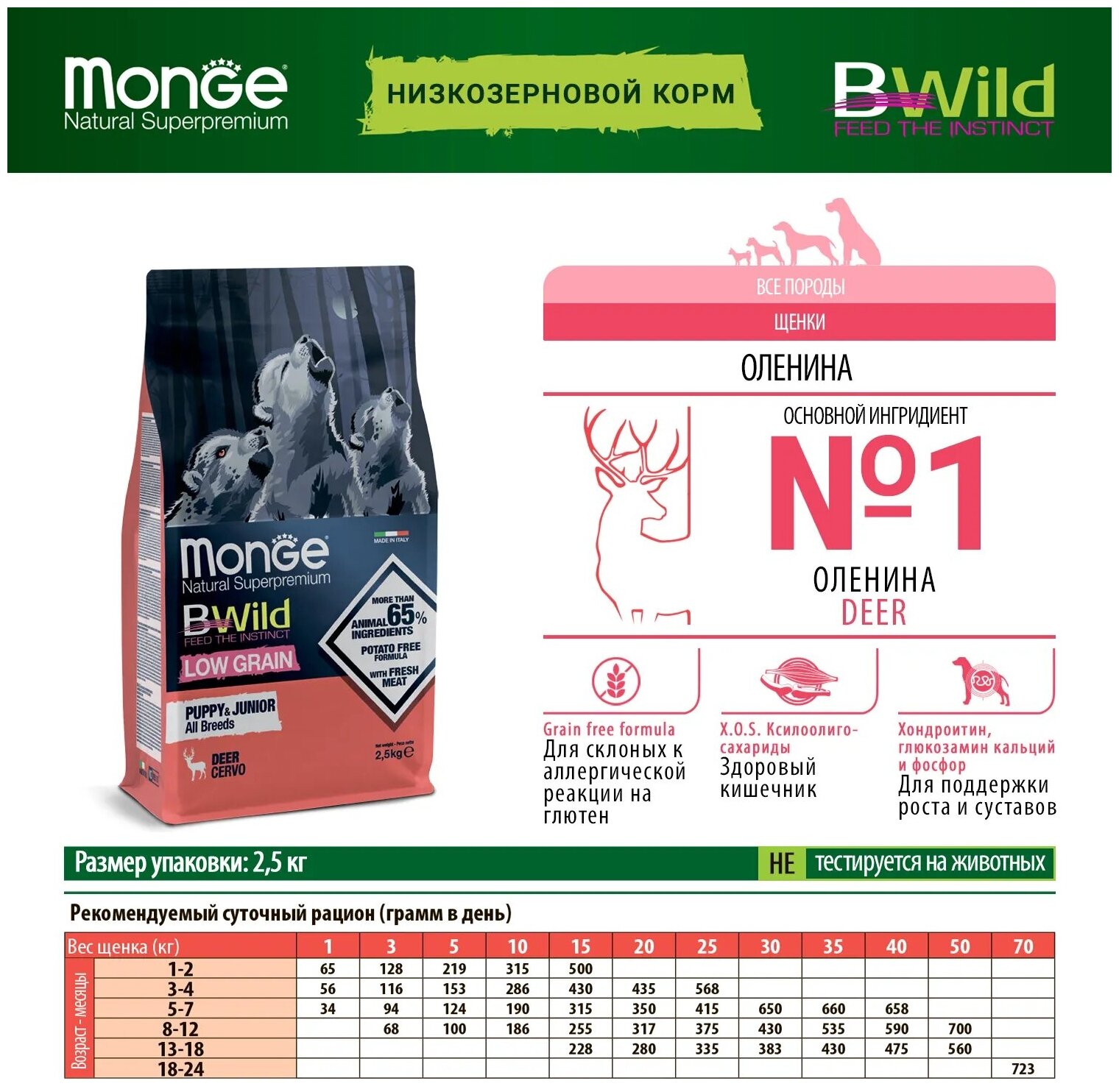 Корм для собак сухой Monge / Монж BWild Low Grain Puppy & junior низкозерновой для щенков, гранулы с олениной 2.5кг / сбалансированное питание