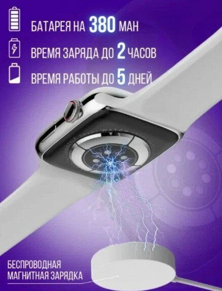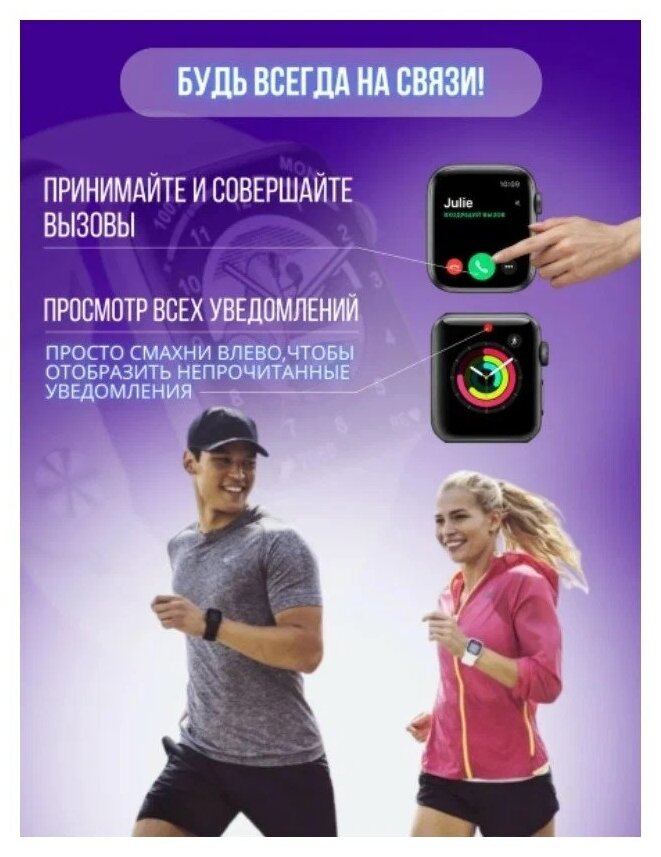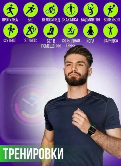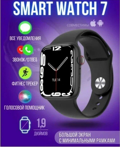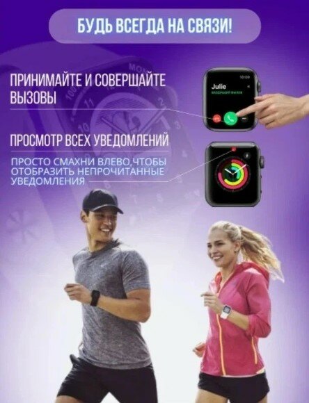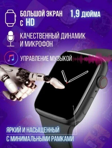Точная копия Apple Watch series 7, кроме коробки; Пульс, Арт. давление и Кислород в крови меряют точно, если сверять с тонометром и пульс-оксиметром; Водонепроницаемые (погружение в трёхлитровую банку прошли успешно, "20 минут - заплыв нормальный"); В приложении (Wear Pro) для этой модели есть около 1000 (если не больше) разных циферблатов и сортировка под разные категории, кстати, на циферблат можно пришпандорить даже свою физиономию или логотип или ещё что-нибудь, на что хватит фантазии; В П. О. часов даже вшили фонарик (белый экран на макс. яркости) и вибратор для удаления влаги из динамика; Есть даже регулировка яркости (свайп вниз на главном экране и открывается шторка настроек, как на телефоне); Также есть калькулятор, секундомер, таймер, будильник и время настраивается на самих часах, в отличие от Mi Band и Huawei Honor Band; Always On Display(всегда включенный дисплей) - отдельная тема, жаль только что зелёный вариант с горизонтальным поворотом работает только во время зарядки; Настроек больше, чем шестерёнок в Курантах; Можно управлять музыкой, играющей на телефоне или в наушниках, да и на них самих можно слушать музыку, динамик стоит хороший; Можно прямо с них звонить или сбрасывать звонок, не доставая телефон из кармана или откуда-то ещё; Инструкция на русском языке |