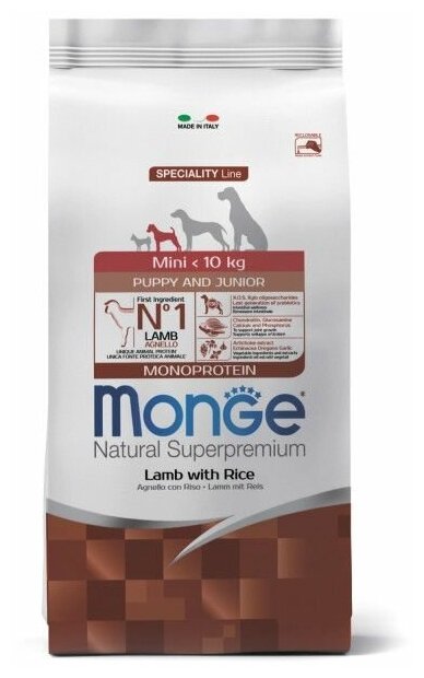 Сухой корм для щенков Monge Speciality line Dog Monoprotein MINI PUPPY & JUNIOR LAMB WITH RICE, ягненок, c рисом, 7.5 кг (для мелких пород)