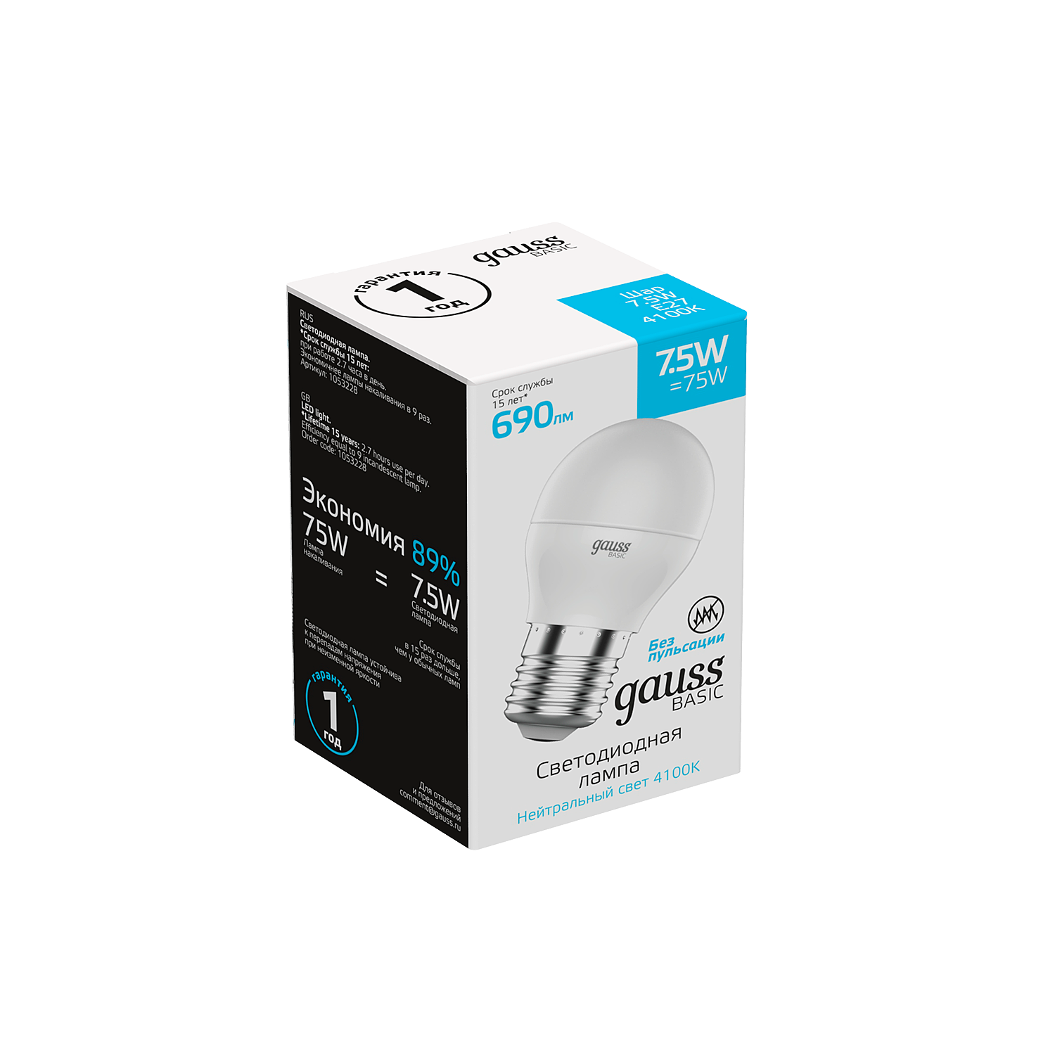 Светодиодная лампа Gauss Basic Шар 7,5W 690lm 4100K E27 LED 1/10/100 интересное: