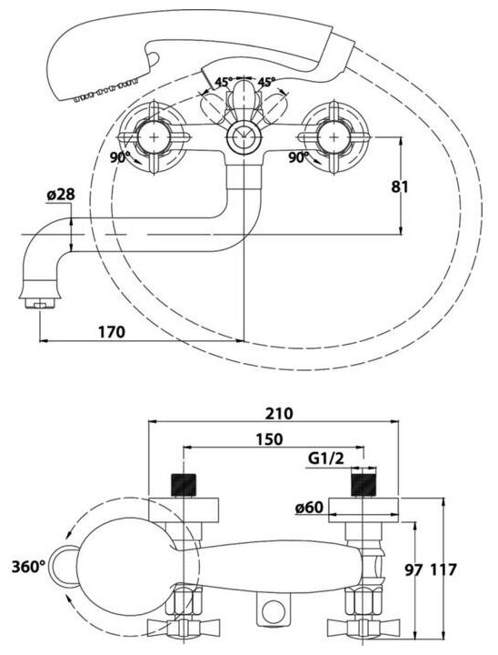 Смеситель для ванны с душем KAISER Cross - 41022 (двухвентильный, цвет хром)