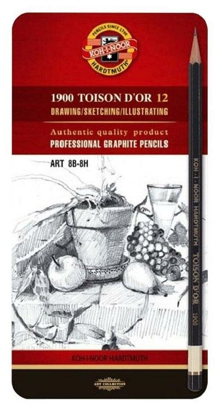 Набор чернографитных (простых) карандашей Koh-I-Noor Toison D'or 1902 Art (8B-8H, заточенные) метал. пенал, 12шт. (1902012009PL)