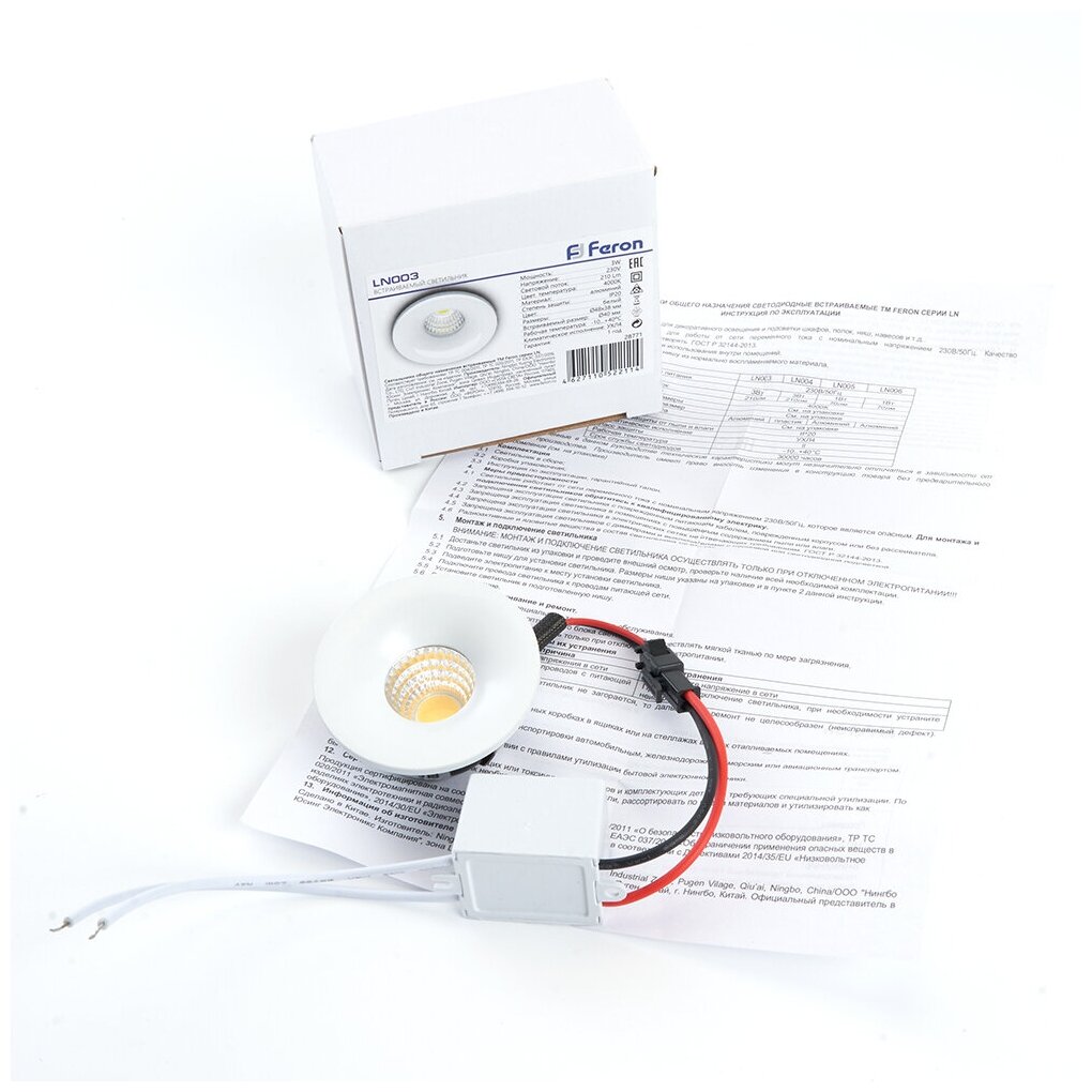 Светильник встраиваемый светодиодный 3W, 210 Lm, 4000К, белый, LN003, Feron, 28771, LED, 3 Вт, 4000, нейтральный белый, цвет плафона: бесцветный