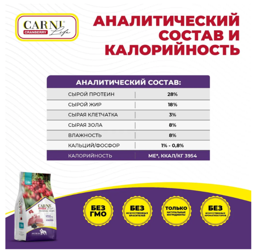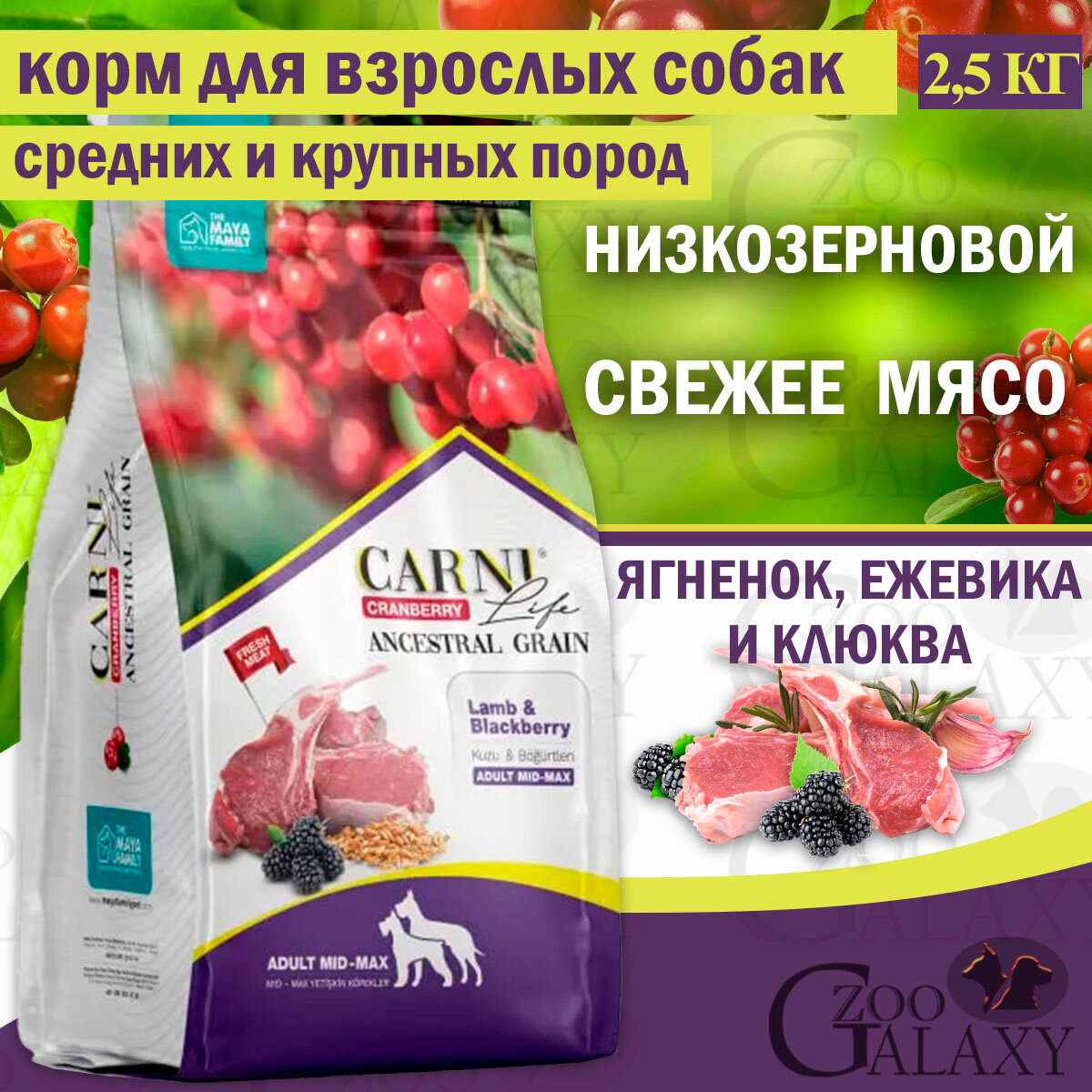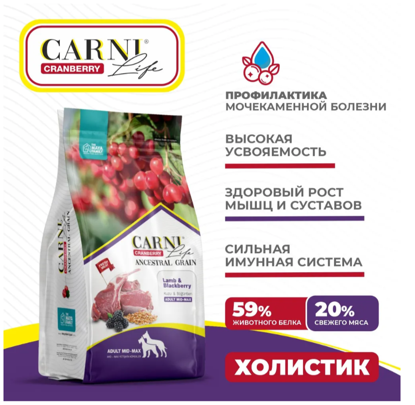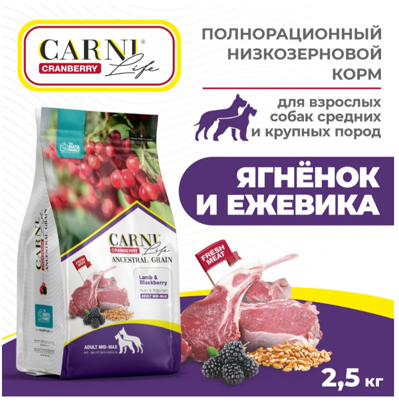 CARNI LIFE ANCESTRAL GRAIN ADULT MEDIUM & MAXI CRANBERRY LAMB & BLACKBERRY низкоз взрос собак средних/крупных пор ягненок/ежевика/клюква (2,5 кг)
