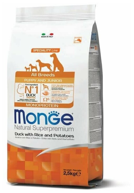 Сухой корм Monge Dog Speciality Line Monoprotein для щенков всех пород, из утки с рисом и картофелем 12 кг интересное: