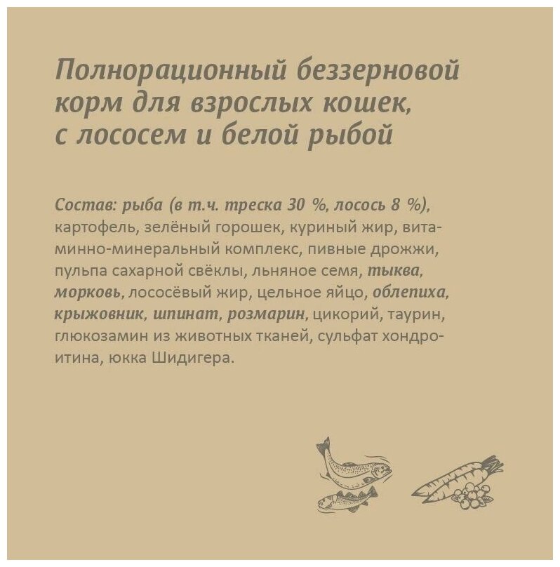 | Состав | рыба (в т.ч. треска 30 %, лосось 8 %), картофель, зелёный горошек, куриный жир, витаминно-минеральный комплекс, пивные дрожжи, цельное яйцо, пульпа сахарной свёклы, льняное семя, тыква, морковь, лососёвый жир, облепиха, крыжовник, шпинат, розмарин, цикорий, таурин, глюкозамин из животных тканей, сульфат хондроитина, юкка Шидигера |
