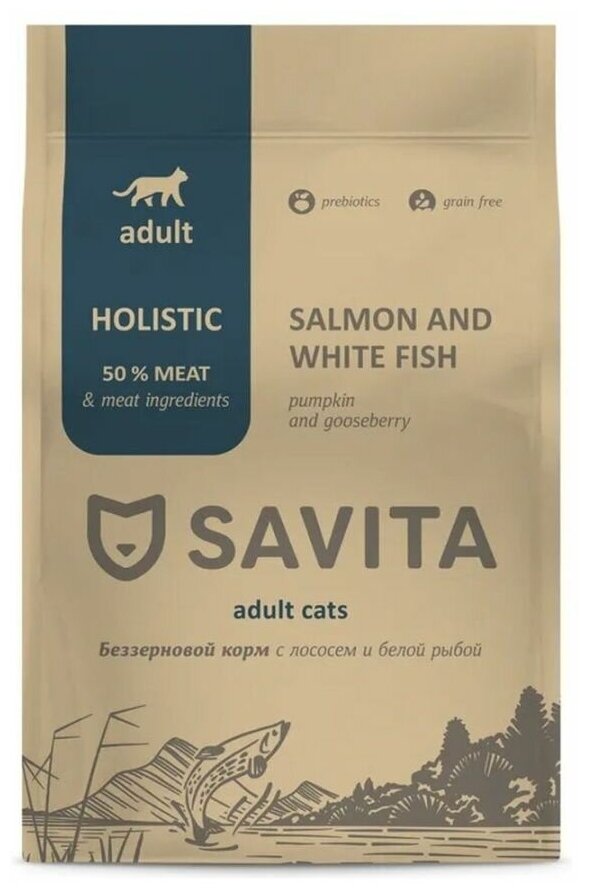 Беззерновой корм SAVITA для кошек с лососем и белой рыбой, GRAIN FREE ADULT, Salmon & White Fish, 5 кг