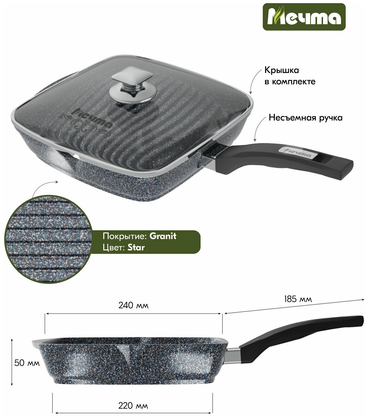 Сковорода гриль Мечта квадратная 24х24 см Гранит с антипригарным покрытием с несъемной ручкой, НЕ индукционная