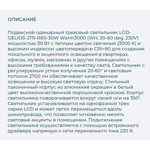 Ниже Вы можете прочитать отзывы на Светильник LGD-GELIOS-2TR-R80-30W Warm3000 (WH, 20-60 deg, 230V) (arlight, IP20 Металл, 3 года), ознакомится с подробными характеристиками, посмотреть интересные обзоры и фотографии на Светильник LGD-GELIOS-2TR-R80-30W Warm3000 (WH, 20-60 deg, 230V) (arlight, IP20 Металл, 3 года).