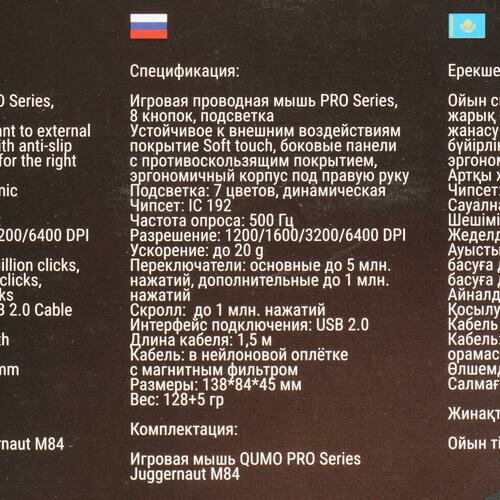 Мышь игровая Qumo PRO Series Juggernaut M84, проводная, оптическая, 8 кнопок, подсветка, 1200/1600/2400/6400DPI