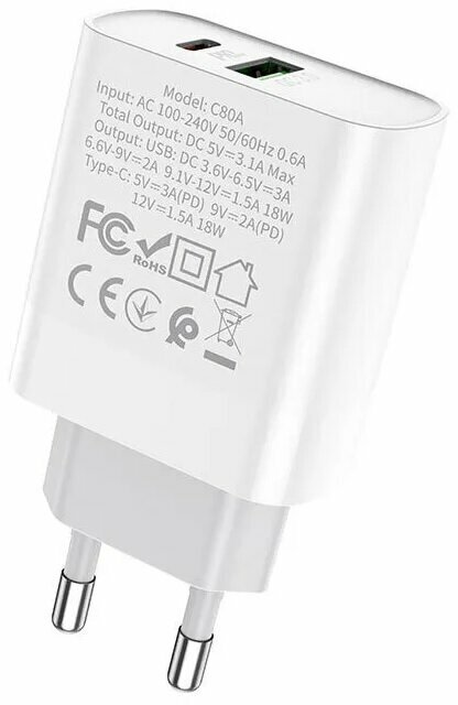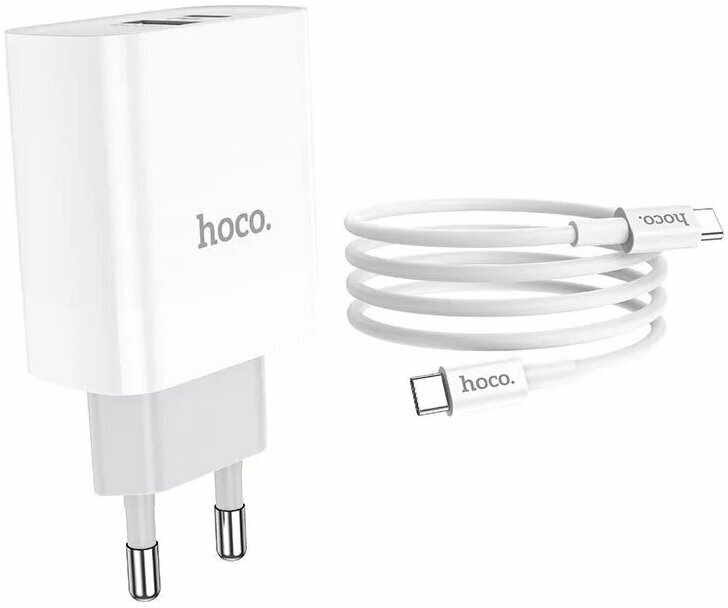 Зарядное устройство для телефона hoco C80A / сетевое / USB + Type-С / PD20W / QC3.0 / белое