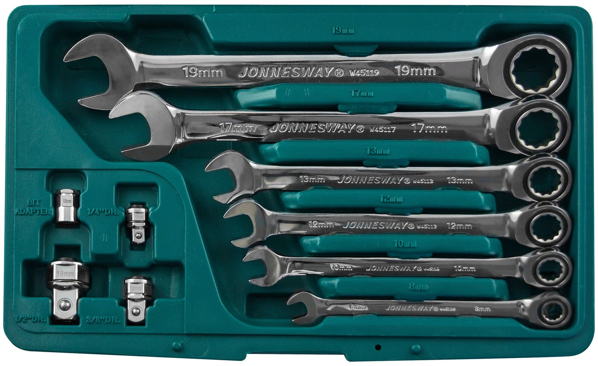 Набор комбинированных трещоточных ключей 8-19 мм и адаптеров 10 предметов Jonnesway W45110S