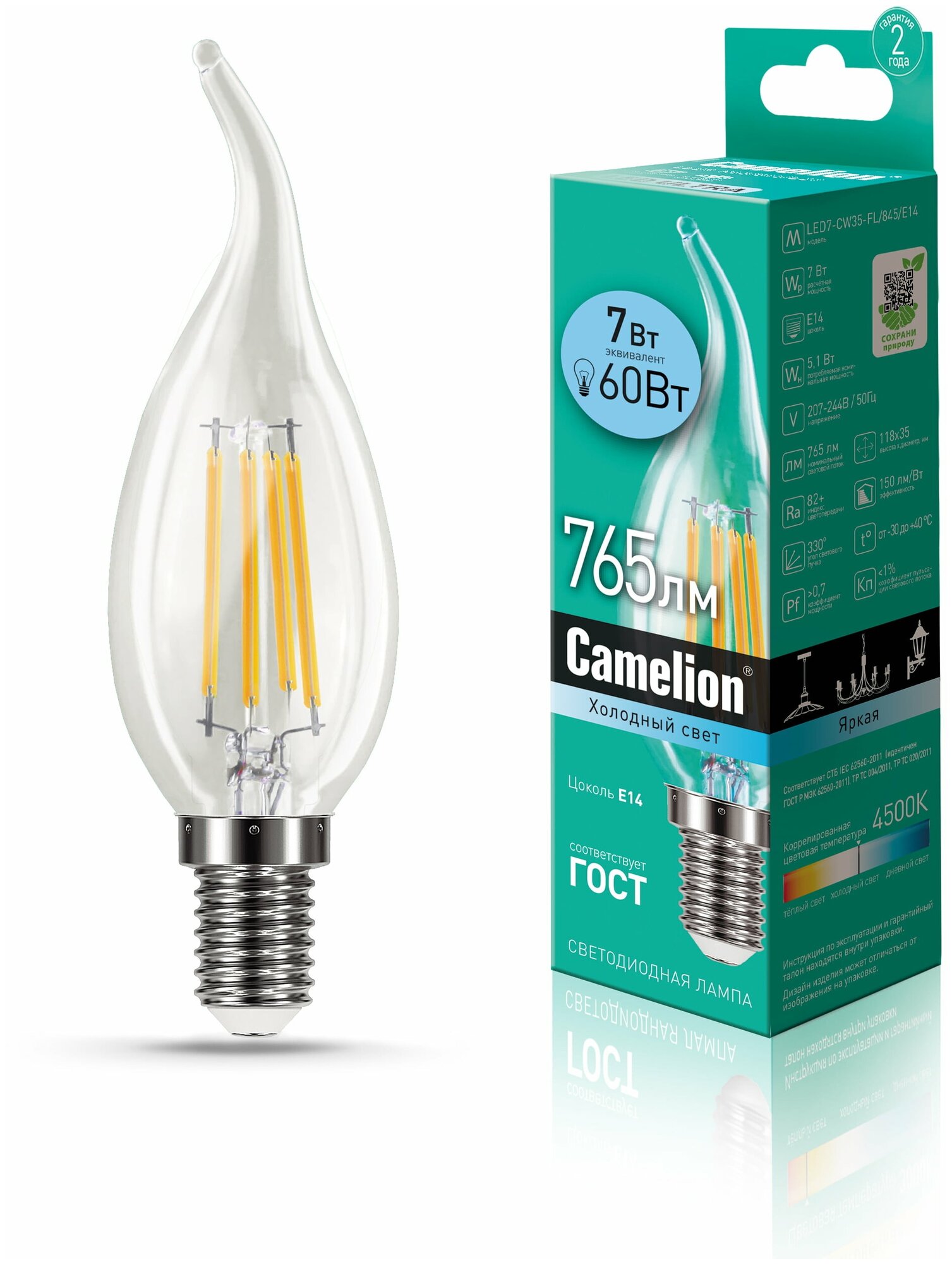 Эл.лампа светодиодная LED7-CW35-FL/845/E14 (7Вт=60Вт 765Lm 220В) Camelion