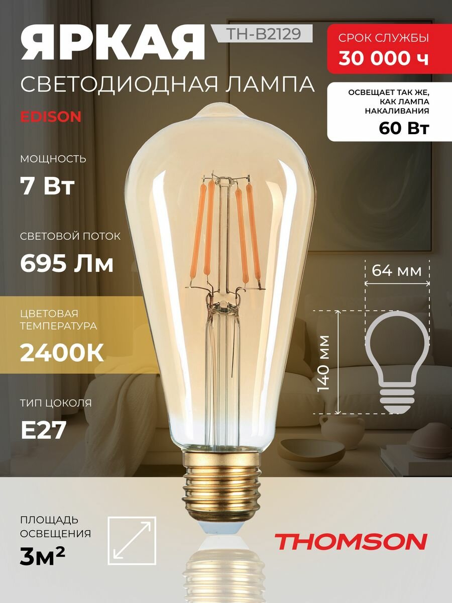 Лампа филаментная Thomson E27, эдисон, 7Вт, TH-B2341, одна шт.