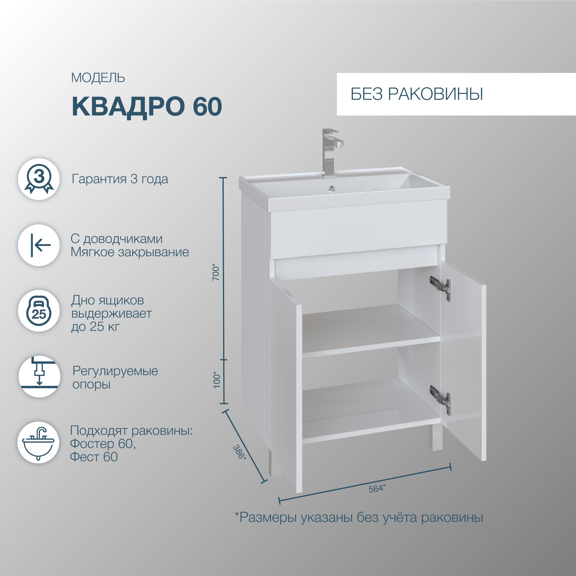 Тумба напольная SanStar Квадро 60 Без раковины для ванной комнаты, белая интересное: