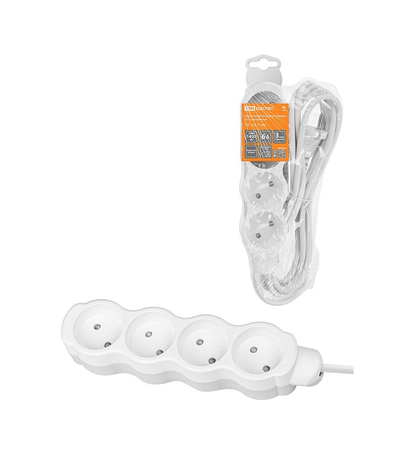 Удлинитель бытовой 4 гн, 5 м, ПВС, 2х0.75 мм2, б/з, 10 А, 250В,с з/ш, бело-сер, TDM, Люкс УЛ4, SQ130