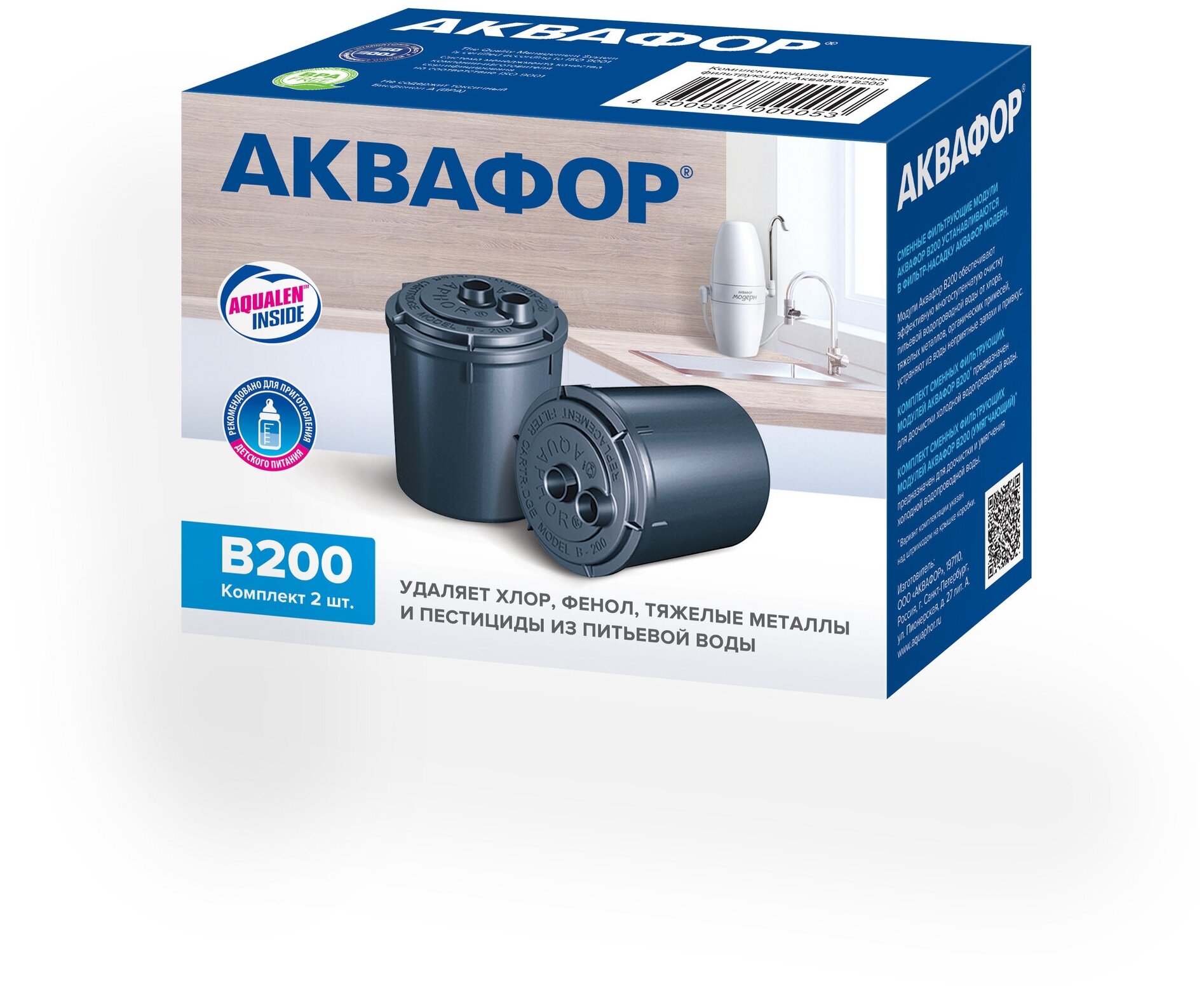 | Дополнительная информация | картриджи к системе Модерн; индивидуальная упаковка универсальна для товаров "комплект сменных модулей В200" и "комплект сменных модулей В200 умягчающий", вариант комплектации указан над штрихкодом на крышке коробки |