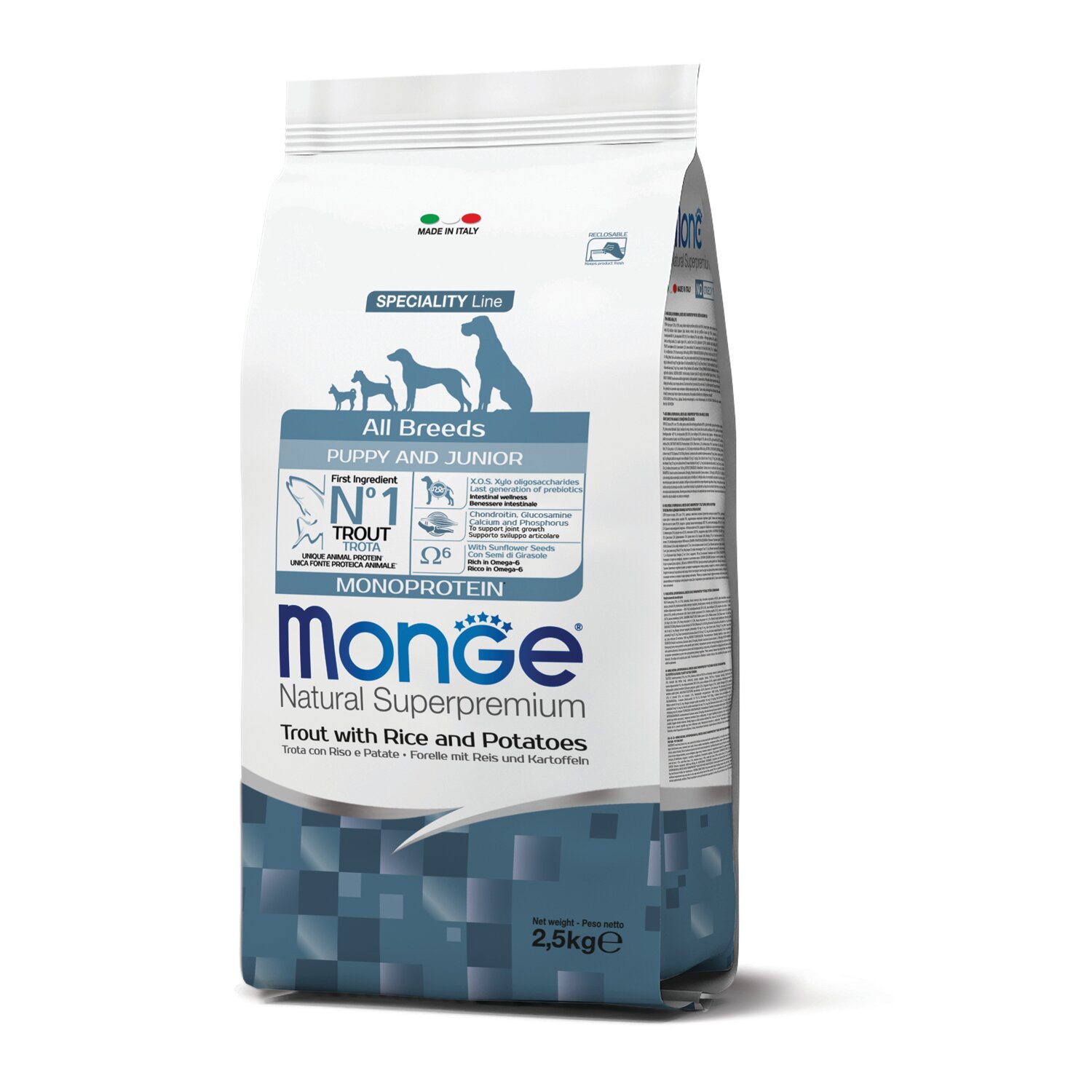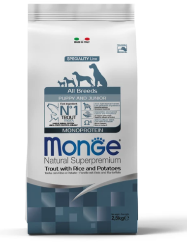 MONGE SPECIALITY MONOPROTEIN PUPPY & JUNIOR TROUT монобелковый для щенков всех пород с форелью, рисом и картофелем (2,5 кг)