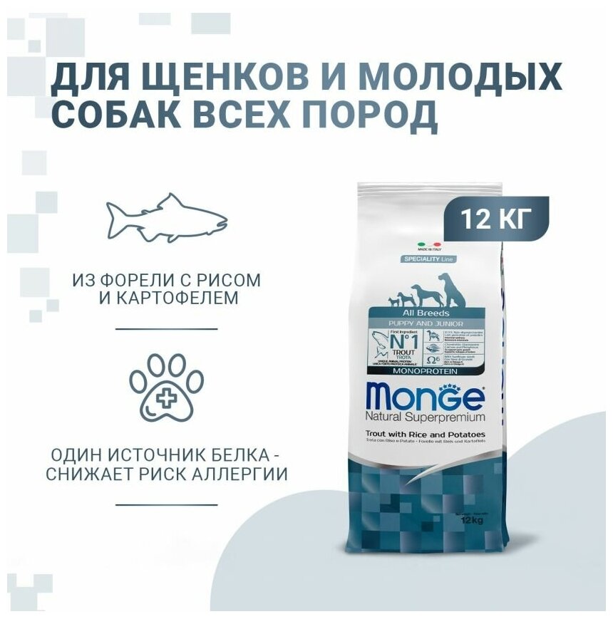 Monge Dog Speciality Line Monoprotein сухой корм для щенков всех пород с форелью, рисом и картофелем - 12 кг