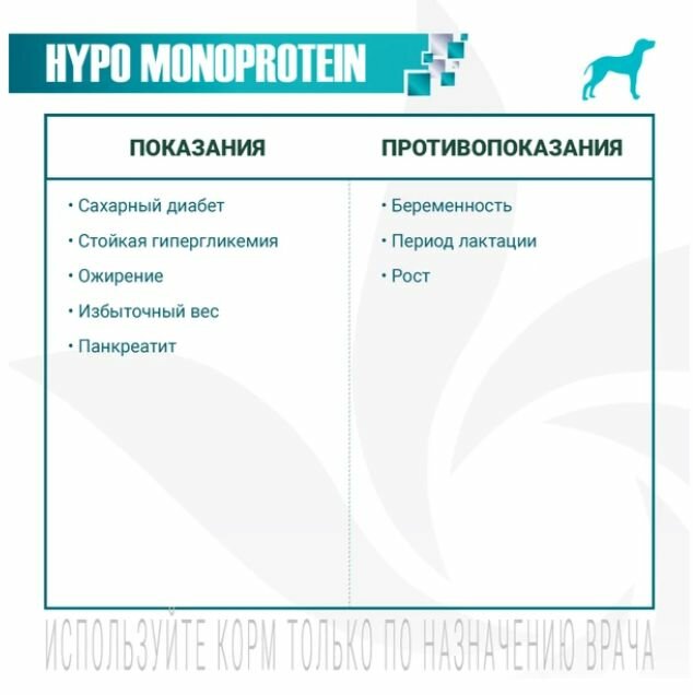 | Дозировка | Норма кормления и период применения диеты назначается только ветеринарным врачом. Рекомендуемая продолжительность кормления диетическим рационом: от 3 до 8 недель. При условии устранения симптомов непереносимости, рацион можно использовать первоначально до одного года. Суточная порция корма составляет 740 г для взрослой собаки весом 10 кг. Рекомендуемую суточную порцию корма можно разделить на 2 приема. |