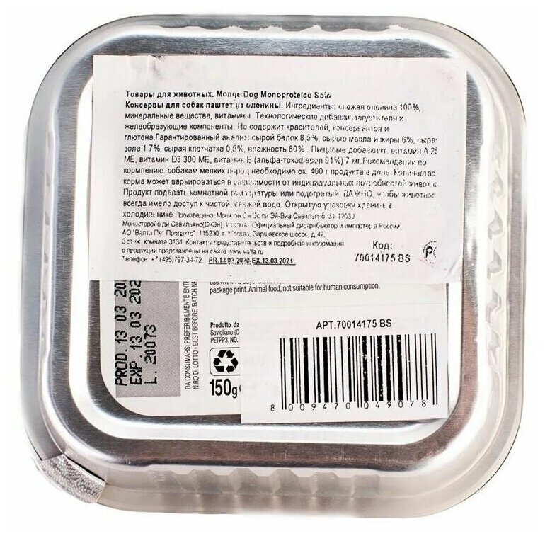 Влажный корм для собак Monge Monoprotein SOLO CERVO, беззерновой, оленина, 10 шт. х 150 г