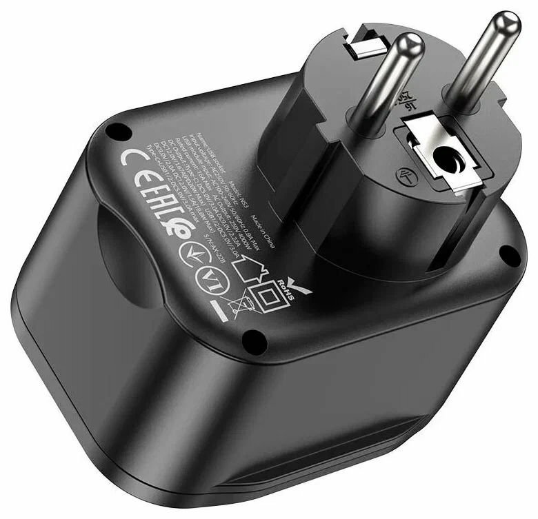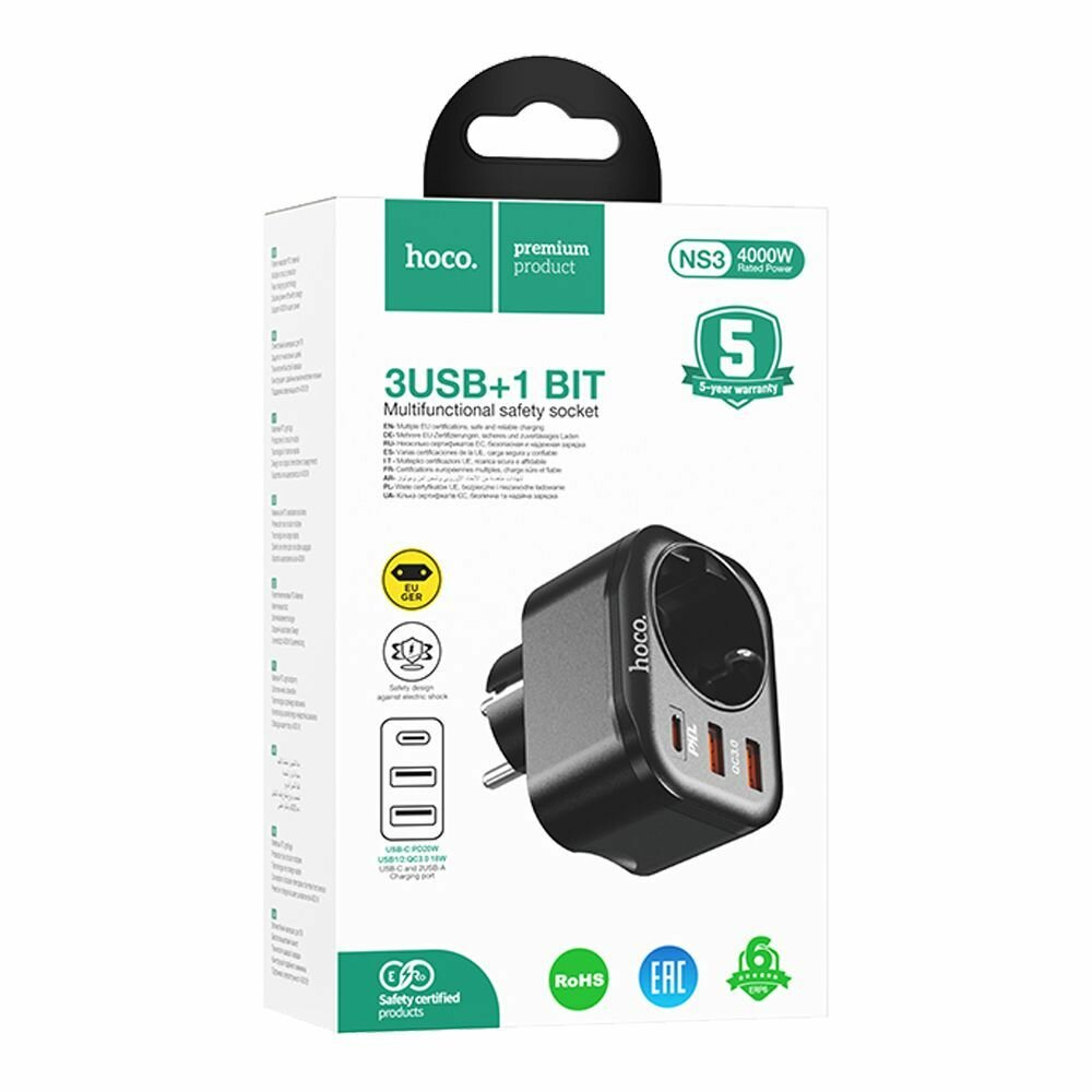 Переходник для розетки+2USB+1PD, NS3, HOCO, черный