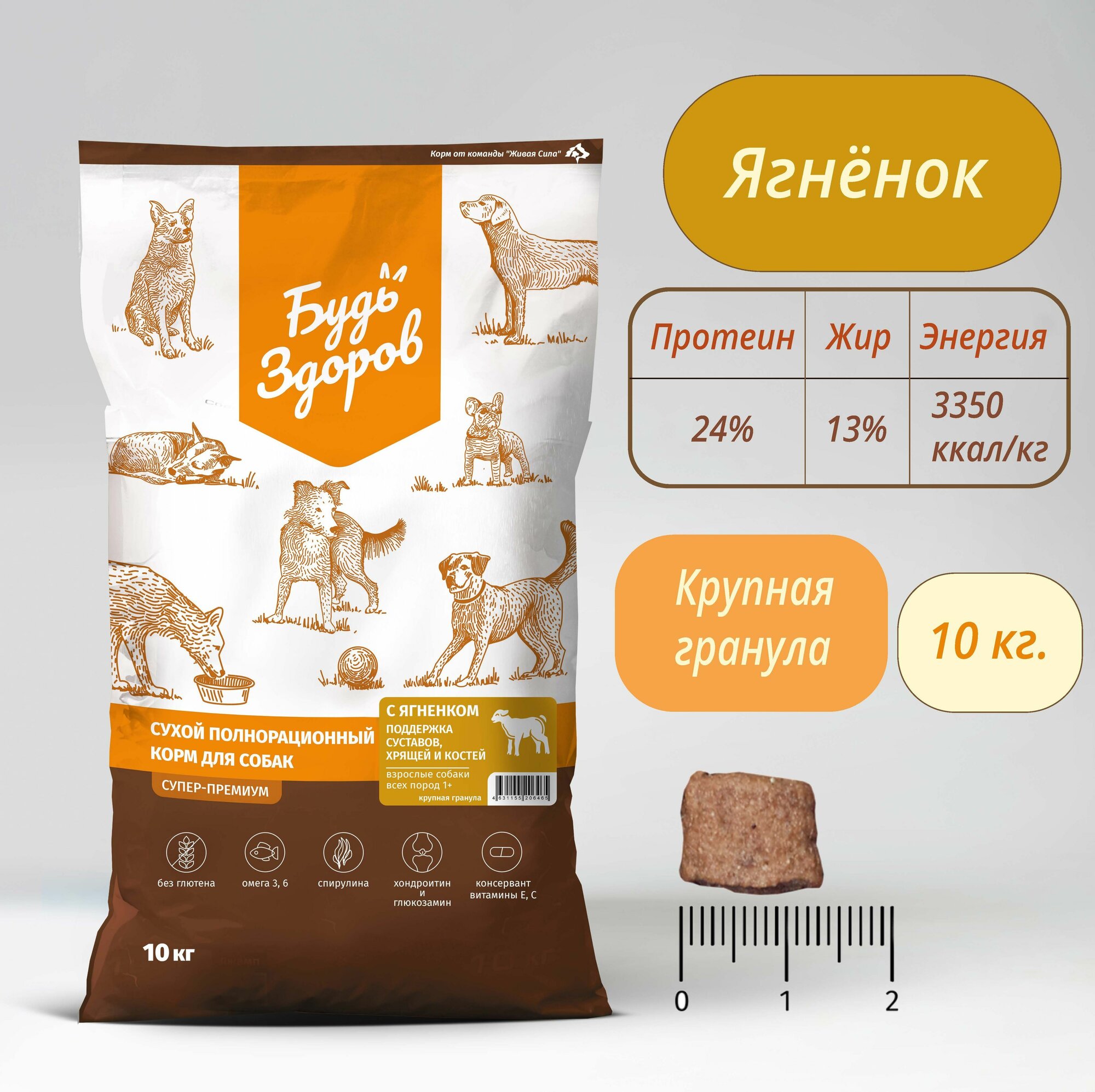 10 кг Будь Здоров. С ягненком. Сухой полнорационный корм для взрослых собак всех пород 1+. Поддержка суставов, хрящей и костей. Крупная гранула.