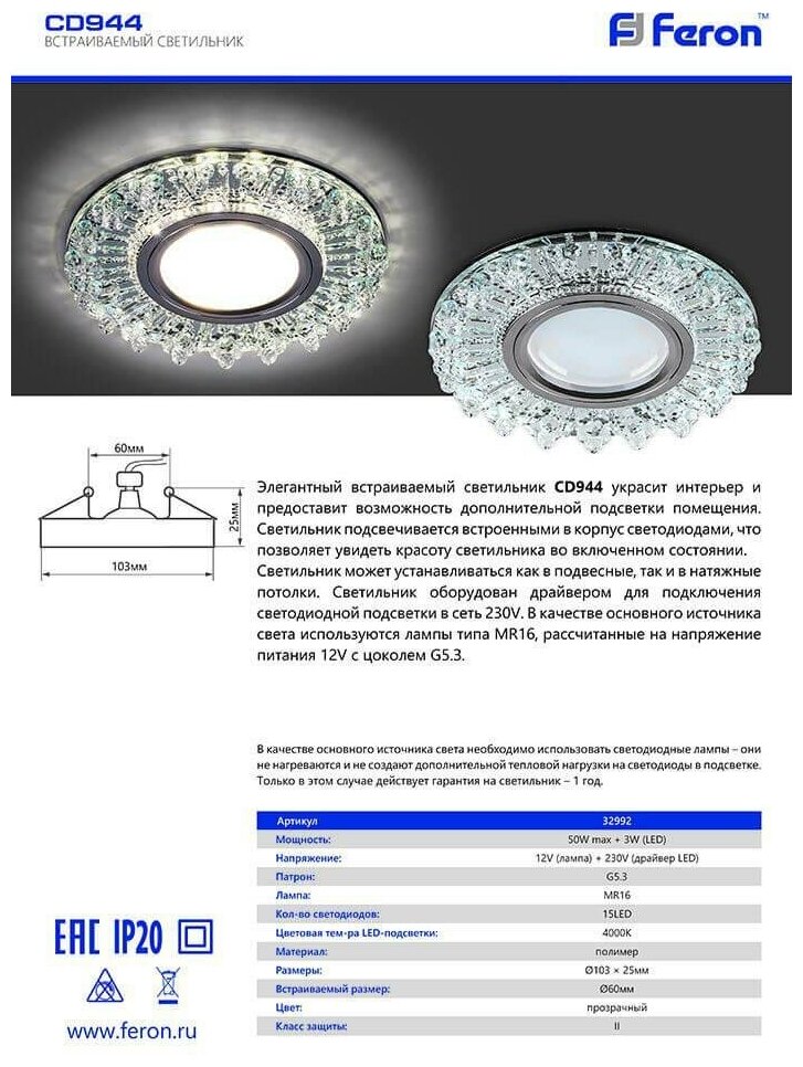 Светильник Feron Светильник встраиваемый с подсветкой 4000K, MR16 50W G5.3, прозрачный, хром, CD944 Feron, 32992, GU5.3, 50 Вт, цвет арматуры: хром, цвет плафона: бесцветный