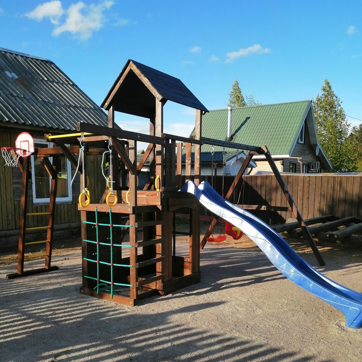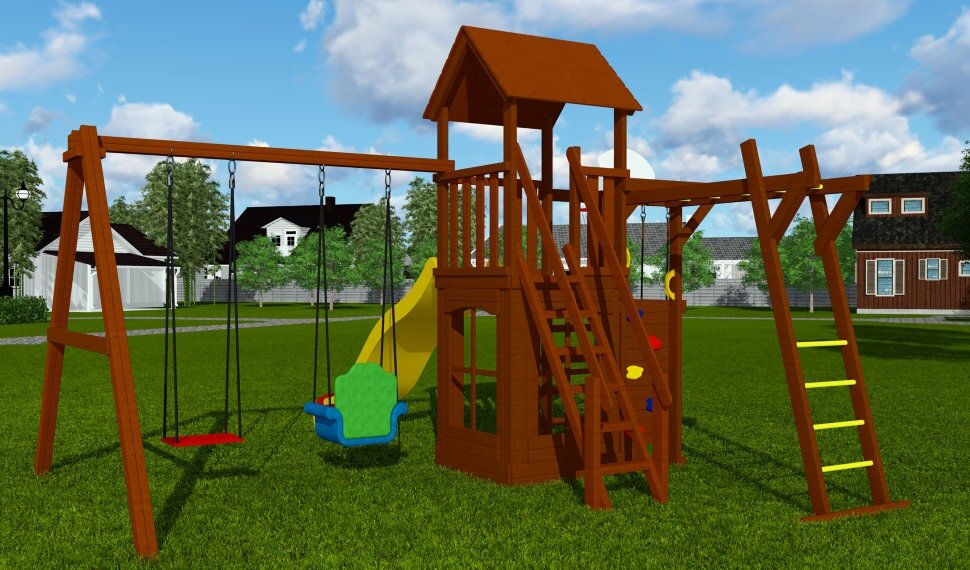 | Комплектация | игровая башня (высота 3,2 метра), домик - лестница с перилами - горная стенка, турник, горка 3 метра, кольца гимнастические, модуль сетка, шведская лестница, качели для детей от 3х лет, качели - трансформер (от 1 года до 15 лет), ручки пластиковые - 6шт, рукоход |