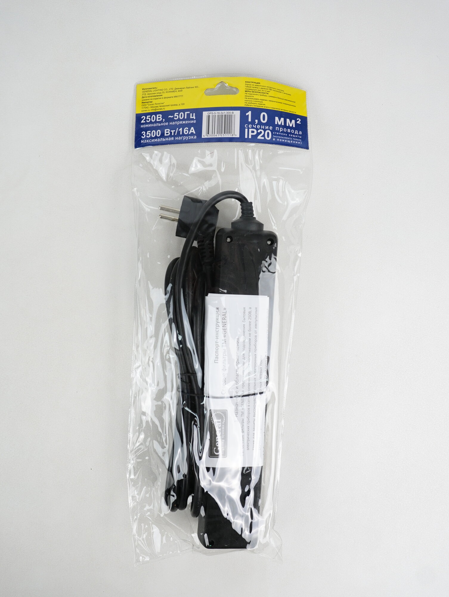 Сетевой фильтр General с заземлением и выключателем, 5 гнезд, 16A, 2500Вт, черный, 3 метра (3х1мм) (GPS-5-16-3x1-300-B)