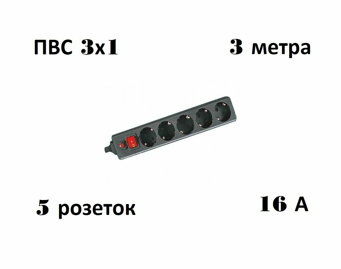 Сетевой фильтр 5 розеток, 3 м, 16 А, черный, Китай