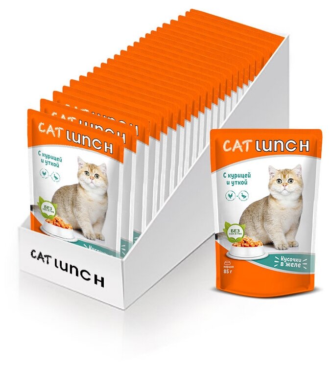 Влажный корм для кошек Cat Lunch кусочки в желе Курица и Утка, паучи по 85г (24 шт. в упаковке) интересное: