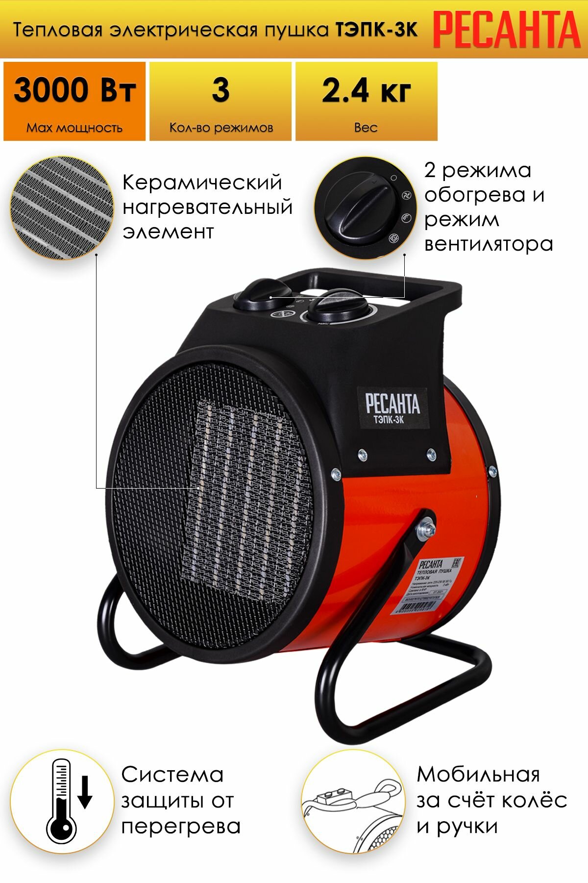 Тепловая электрическая пушка ТЭПК-3K (керам. нагревательный элемент) круглый корпус Ресанта, шт