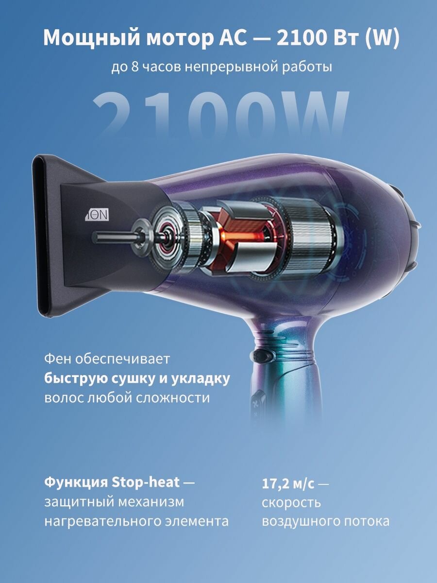 Фен DEWAL SPECTRUM COMPAСT, бирюз.хамел, вес 600гр, размер 18см, 2100Вт, ионизация, 2 нас, провод 3м DEWAL MR-03-109 Chameleon