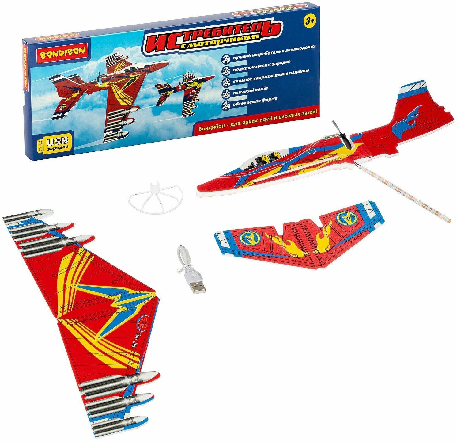 Самолёт истребитель с моторчиком Bondibon , сборный, аккумуляторный, ВОХ 31х12х2,5 см, цвет красн