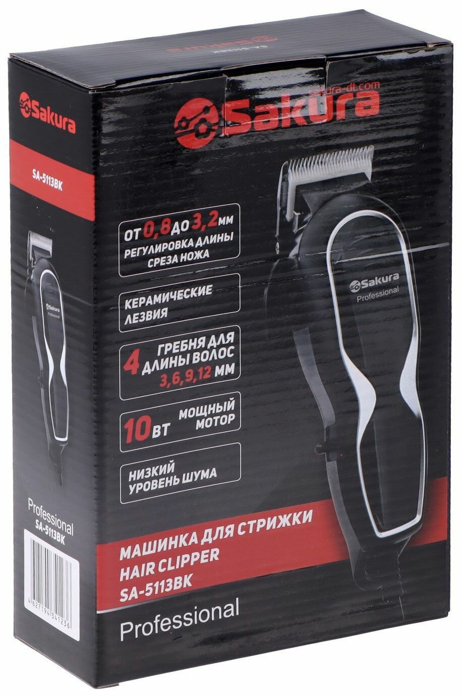 SAKURA Машинка для стрижки Sakura SA-5113BK Professiоnal, 10 Вт, 1-12 мм, 4 насадки 220 В, чёрная