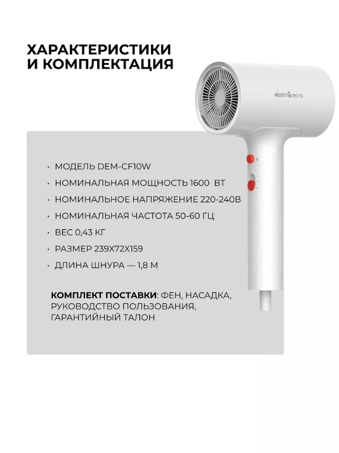 | Подробная комплектация | Фен для волос DEERMA DEM-CF10W, Насадка, Документация" |
