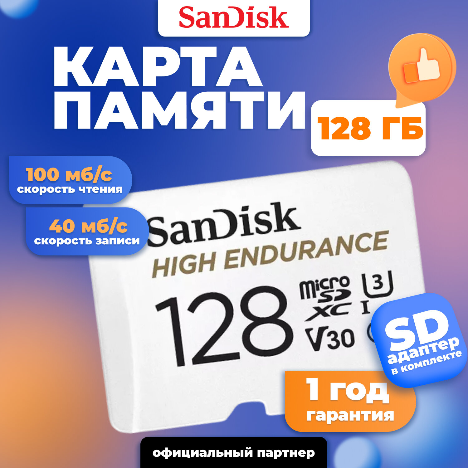 Карта памяти SanDisk microSDXC 128 ГБ Class 10, V30, UHS-I, R/W 100/40 МБ/с