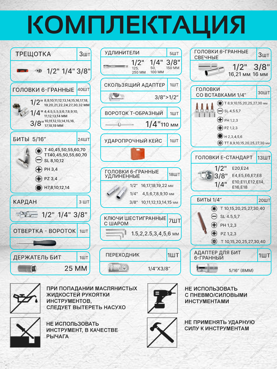 | Аксессуары в комплекте | бита-адаптер для торцевых головок / держатель для бит / переходник для головок / удлинитель для головок / шарнир карданный для головок |