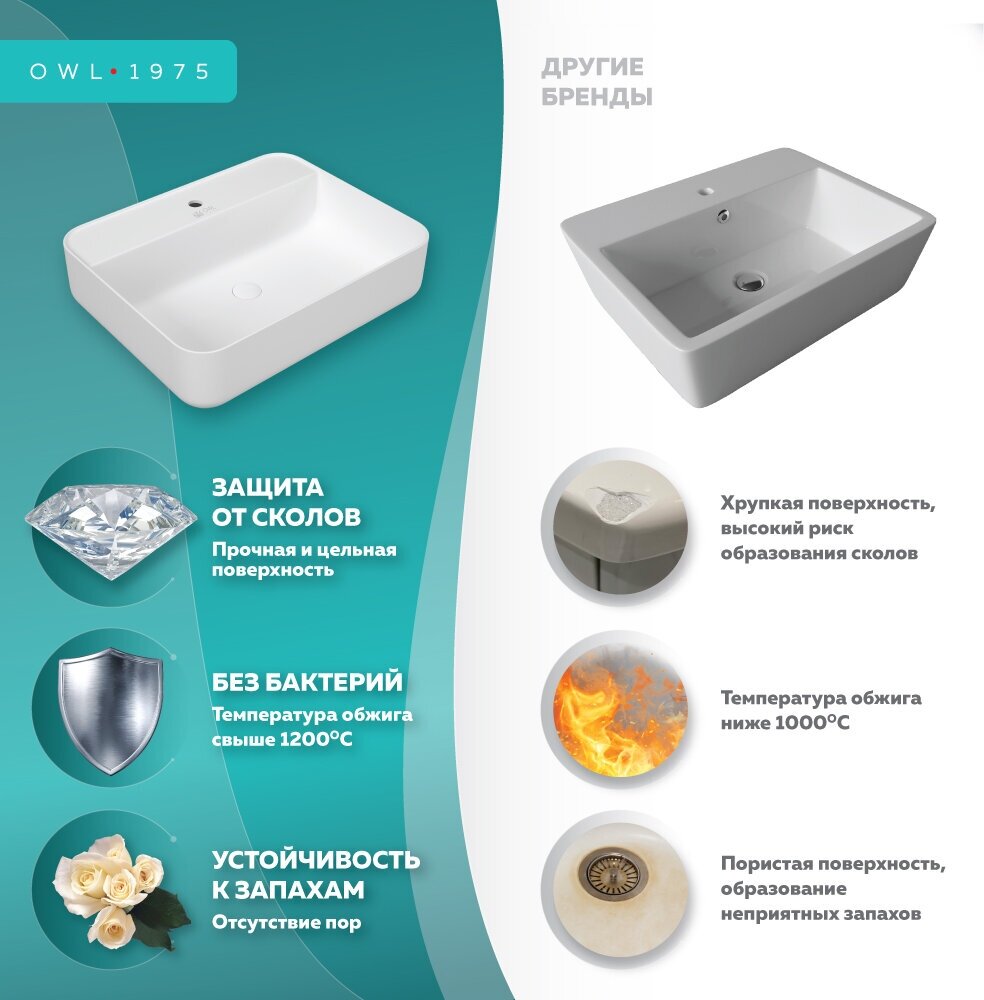 Раковина накладная OWL 1975 Vind белая прямоугольная с полочкой под смеситель 500*400*135 OWLB191036 интересное: