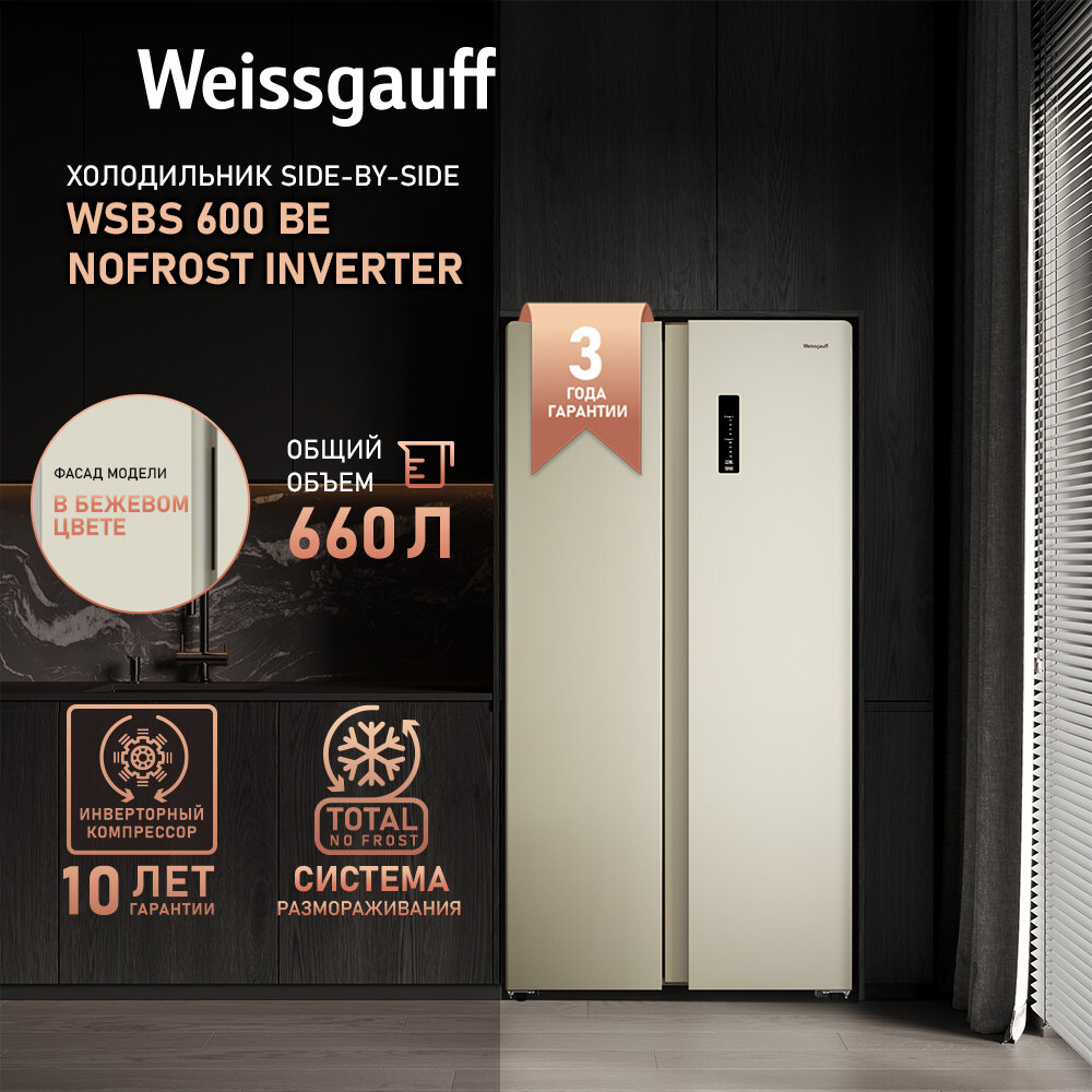 Холодильник Weissgauff WSBS 600 Be NoFrost Inverter, бежевый Side by Side двухдверный, 3 года гарантии, Мощность замораживания 12 кг сутки, Объём 660 л, Сенсорное управление, Цифровой дисплей, Суперзаморозка, LED освещение, A++