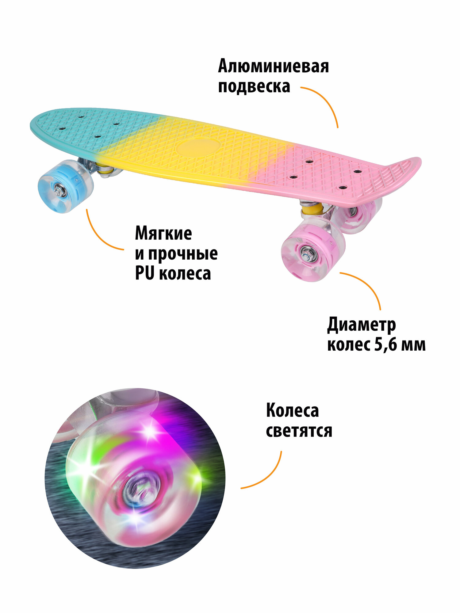 Пенниборд детский X-Match Х-Match 56,5х14,5 см, PU колеса со светом, голубо-желто-розовый (649106)