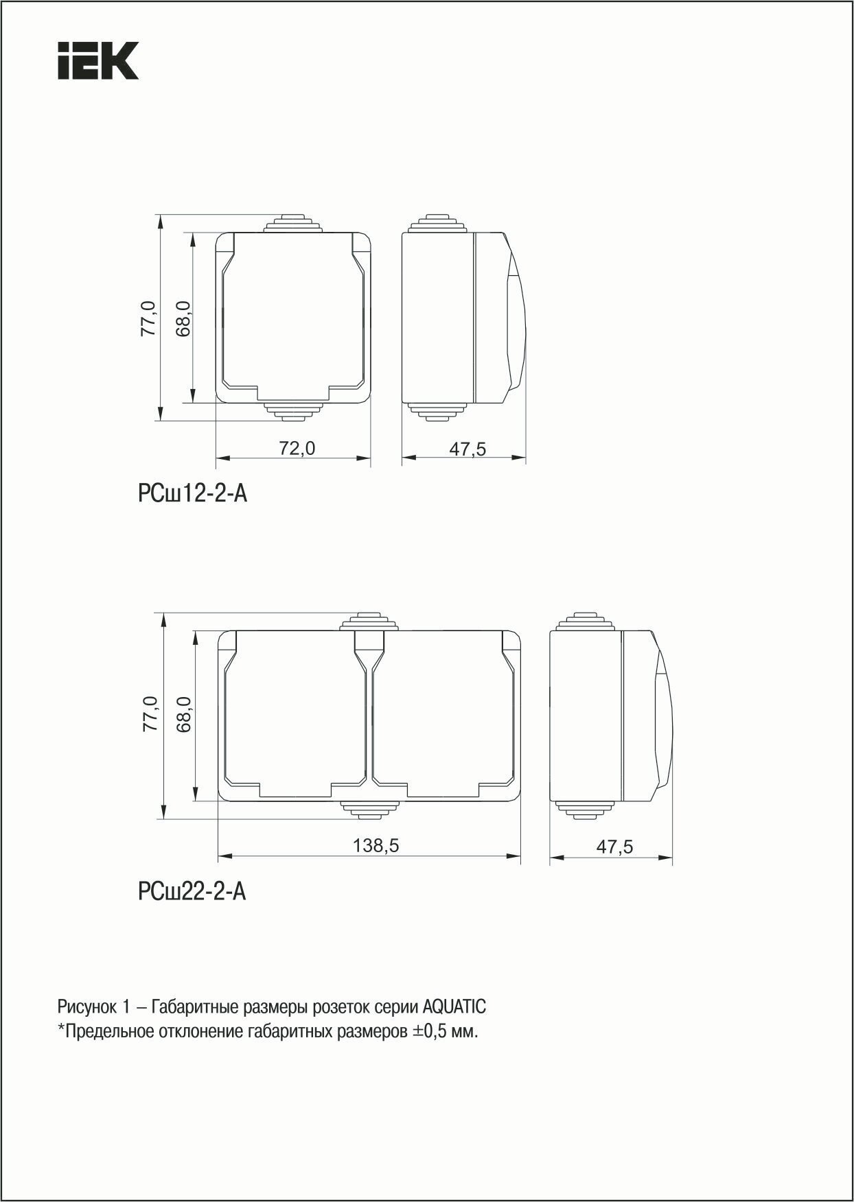 Розетка двухместная для открытой установки РСш22-2-А с заземляющим контактом и крышкой 16А IP54 IEK серия Aquatic