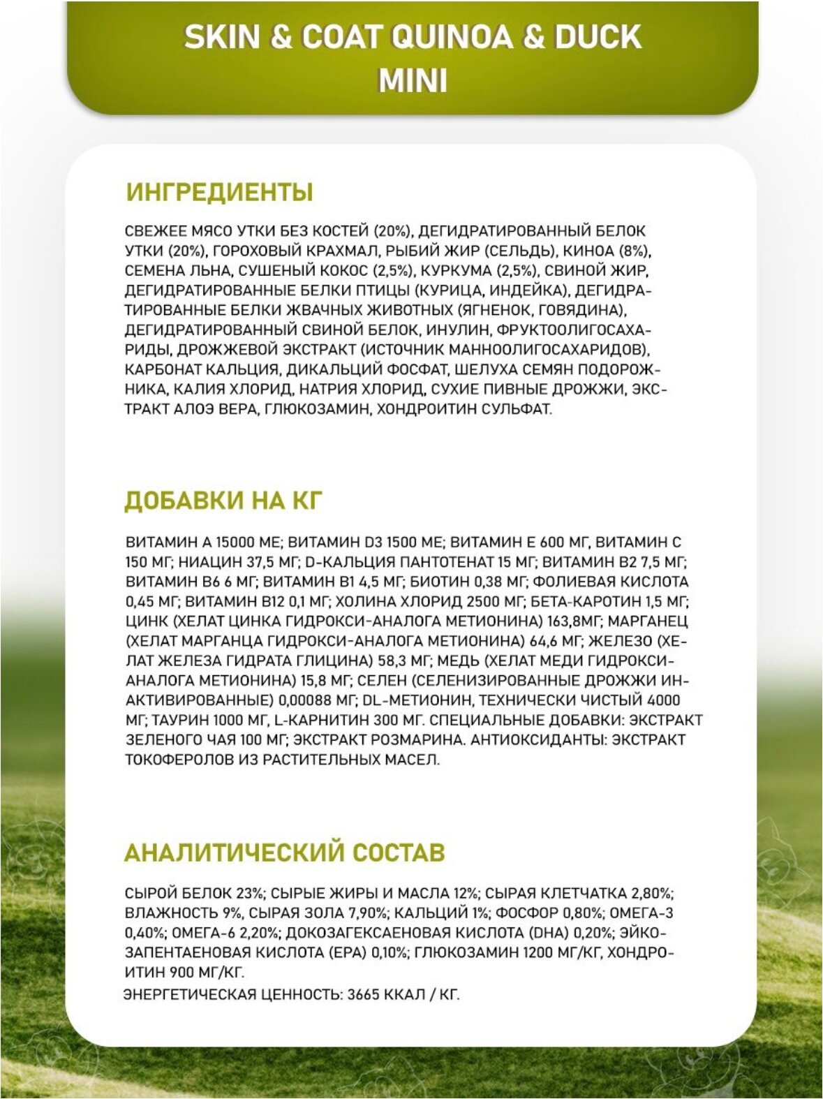 | Состав | утка без костей (20%), обезвоженный утиный белок (20%), гороховый крахмал, рыбий жир (из сельди), экстрагированные семена киноа (8%), льняное семя, сушеный кокос (2,5%), куркума (2,5%), инулин, фруктоолигосахариды, дрожжевой экстракт (источник манноолигосахаридов), карбонат кальция, дикальцийфосфат, шелуха и семена псиллиума, хлорид калия, хлорид натрия, сушеные пивные дрожжи, экстракт алоэ вера, глюкозамин, хондроитинсульфат. Источники белка: утка без костей, обезвоженные белки утки. Источники углеводов: гороховый крахмал, экстрагированные семена киноа. |