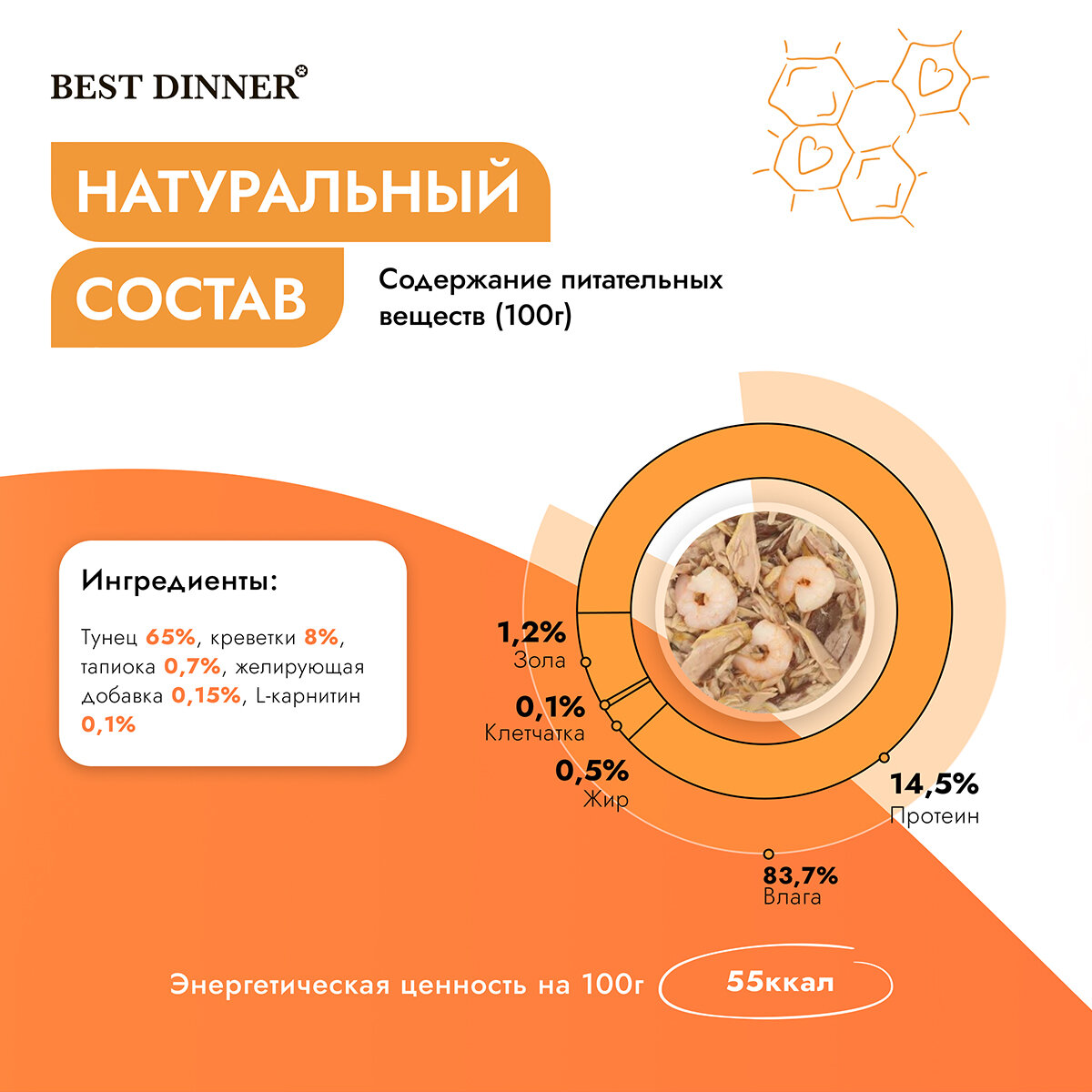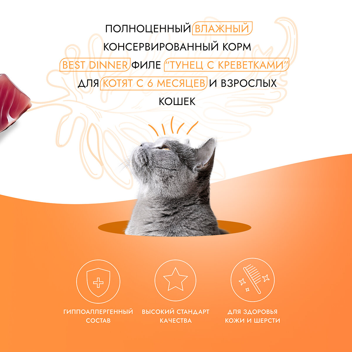 | Состав | Тунец 65%, креветки 8%, тапиока 0,7%, желирующая добавка 0,15%, L-карнитин 0,1%. |