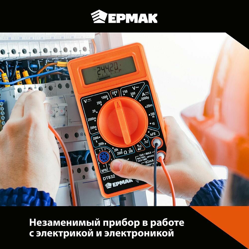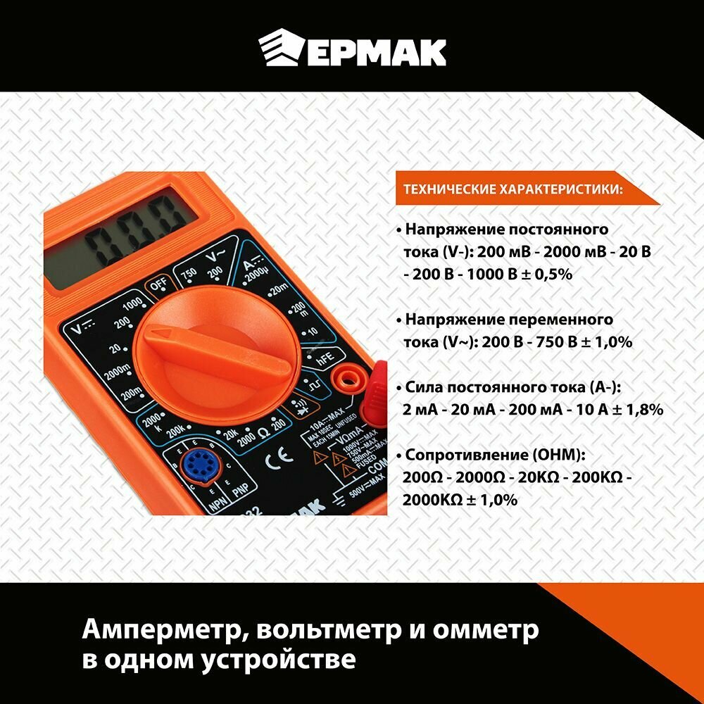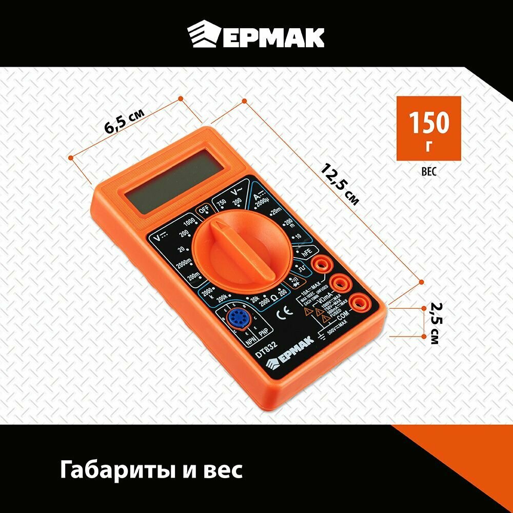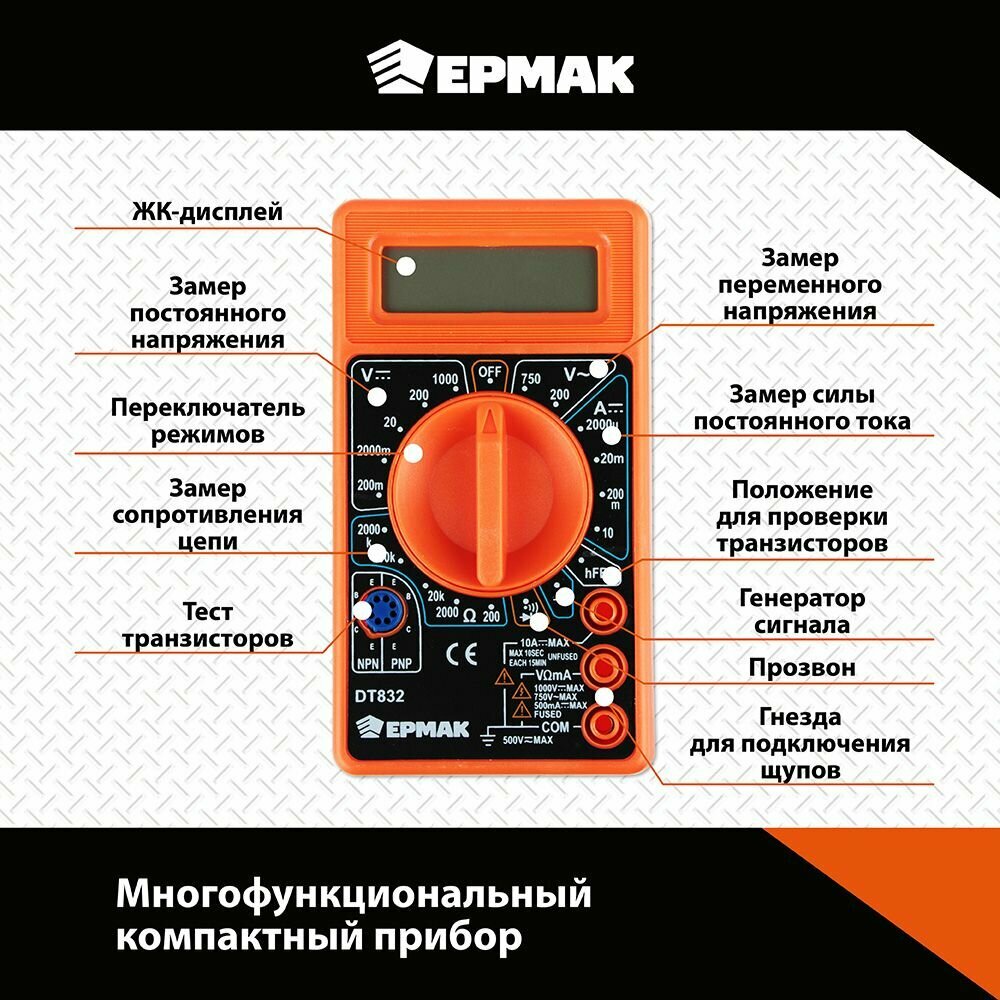 Мультиметр цифровой Ермак, DT-832, с амперметром, вольтметром, омметром, 1 шт