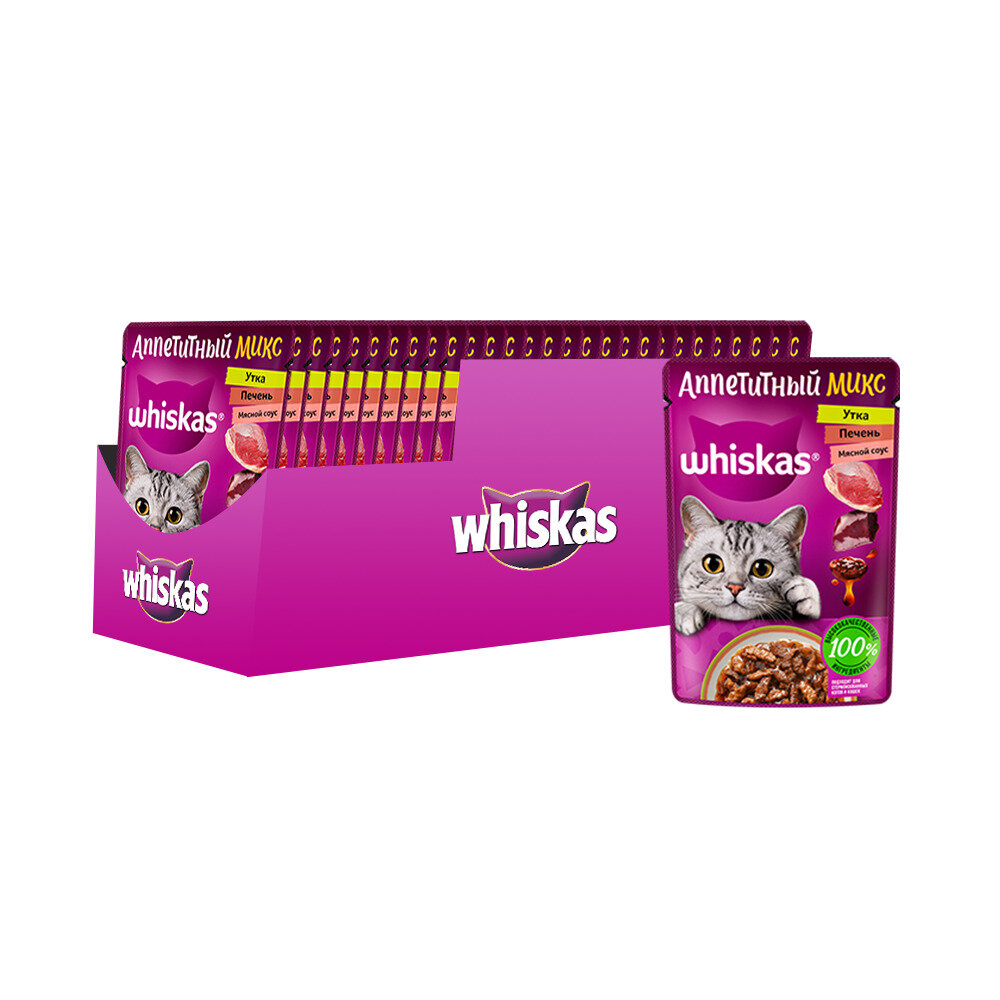 Whiskas Аппетитный микс влажный корм для взрослых кошек, с уткой и печенью в мясном соусе, в паучах - 75 г х 28 шт